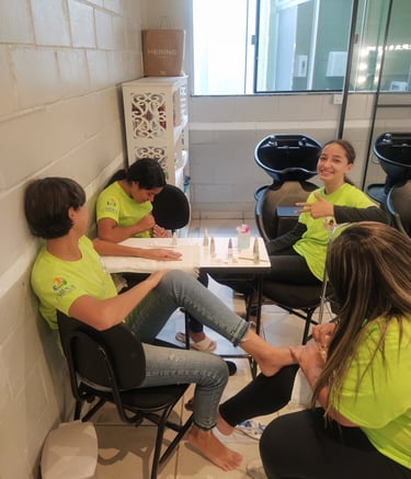 A oficina de manicure e pedicure ensina técnicas básicas de cuidados com as unhas, higiene e estética, preparando adolescentes para uma possível atuação profissional. Além de estimular a criatividade e o empreendedorismo, contribui para a geração de renda e o empoderamento pessoal.